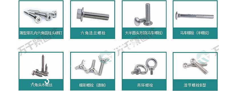 名稱: 1.機螺釘 2.自攻螺釘 3.鉆尾螺釘 4.墻板釘 5.纖維板釘 6.木螺釘7.六角木螺釘 8.不脫出螺釘 9.組合螺釘 10.微型螺釘 11.家具螺釘 12.電子螺釘 頭型: 1.六角頭(hexagon head) 2.六角頭法蘭面(hexagon head with flange) 3.方頭(square head) 4.T形頭T head (hammer head)5.扁圓頭mushroom